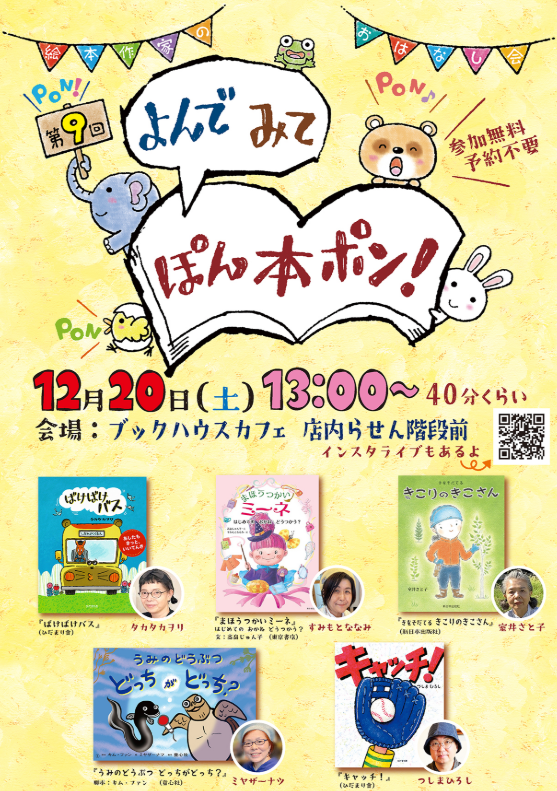 イベント名:絵本作家のおはなし会 第9回『よんで みて ぽん本ポン!』https://bookhousecafe.jp/event/content/2099 日時:2025年12月20日(土)13:00〜(40分くらい) 参加無料・予約不要